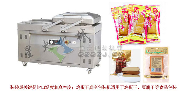 雞蛋干是改變形狀的雞蛋。是以雞蛋為原料的新食品。是將雞蛋全蛋濃縮加工而成,產(chǎn)品營養(yǎng)價值高,含有豐富的優(yōu)質(zhì)蛋白質(zhì),而且包裝輕便易攜帶,成為新時尚休閑零食;雞蛋干的生產(chǎn)工藝比較復(fù)雜,用到的設(shè)備有:打蛋機(jī)——攪拌桶——灌裝機(jī)——蒸煮鍋——鹵煮鍋——真空包裝機(jī)——殺菌鍋等;其中星火食品包裝機(jī)械生產(chǎn)的蛋液灌裝成型機(jī)就起到了灌裝定型的作用;