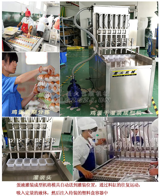 蛋液經(jīng)過攪拌之后就進(jìn)入了定型程序,蛋液灌裝成型機(jī)將模具自動送到灌裝位置,蛋液灌裝機(jī)的計量缸分別連接灌裝頭,通過料缸的往復(fù)運動,吸入定量的液體,然后注入待裝的塑料盒容器中;整機(jī)采用全不銹鋼產(chǎn)品制成,拆裝簡單,易清洗,符合食品衛(wèi)生要求,氣動定量灌裝,六個灌裝嘴同時出料,結(jié)構(gòu)合理,操作方便,易于維護(hù),維修,便于清洗;雞蛋干蛋液灌裝成型機(jī)已成為雞蛋干生產(chǎn)線中必不可少的灌裝設(shè)備;雞蛋干灌裝成型后,然后鹵制,較后經(jīng)過真空包裝機(jī)包裝,成品基本上就完成啦