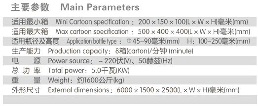 配套瓶裝生產線的后道全自動裝箱生產。同時擁有多項國家技術專利,整機性能可靠,產能高,包裝效果美觀。