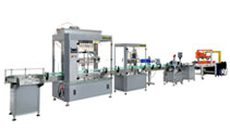該生產線由全自動理瓶機、灌旋—體機、小瓶不干膠貼標機、全自動塑膜裹包機組成,同時可根據生產需要選配鋁箔封口機、噴碼機等。整線僅需1名操作工就能解決以往人工放瓶難、速度慢、灌裝精度低、旋蓋合格率低、貼標不正、塑膜裹包煩等困擾。